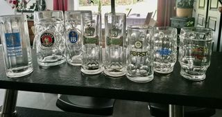 Lot de 8 chopes à bière allemande de collection jamais utilisées : 2 chopes 1 l Paulaner München, HB München (dorure légèrement enlevée voir dernière photo), 2 chopes 0,4 l Forst S