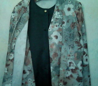 C'est un ensemble composé d'une robe et d'un gilet assorti. La robe a une découpe vert foncé et un imprimé fleurs stylisés blanc, marron, vert. Ses manches sont longues et elle est