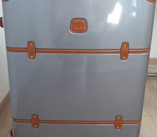 Valise trolley de fabrication italienne, haut de gamme, Bric's référence Bellagio, couleur argent en polycarbonate et cuir. N'a jamais servi Dimensions : H = 76 cm, L = 53 cm, P =
