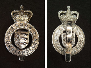 Insigne de casquette d'agent de police du comté de l'Essex, situé au Nord-Est de Londres portant la couronne de la reine Elizabeth II, donc insigne obsolète depuis le mois de septe