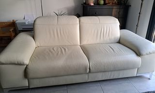Canapé deux places en cuir de couleur crème. Bon état général et propre. Longueur 196 cm Largeur 85 cm Profondeur 55 cm Hauteur 80 cm Modèle avec accoudoirs et repose tête inc
