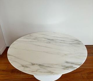 TABLE BASSE finition plateau marbre couleur blanc satiné avec un pied en rilsan blanc Largeur 91 CM Hauteur 38 CM ETAT NEUF