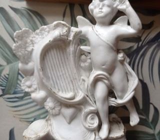 Petit sujet en porcelaine blanche représentant un ange, posé à côté d'une lyre avec des détails floraux, excellent état
