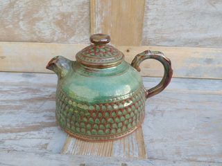 Théière Grès Émaillé Vert Porterie Artisanale Hauteur 14cm, longueur (du bec à l'anse) 21cm, largeur 16,5cm Très bon état