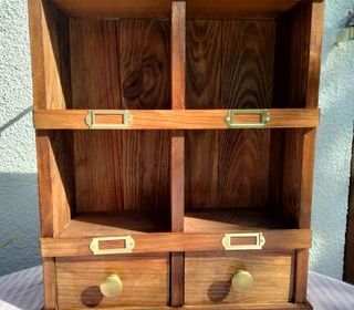 Utilisée comme présentoir et réserve. Pas de date de naissance précise. En pin massif et elle a été traitée, restaurée et teintée chêne clair mixée avec une once de foncé, vernie