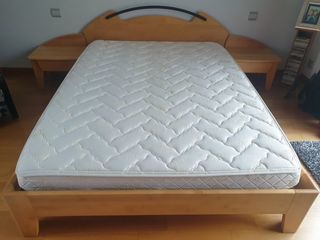 Lit et chevet attenant en chene .Dimensions totales Largeur 255cmx200cm .Chevet seul 50cmx35cm avec tiroir.Hauteur du sommier 22cm .Matelas en mousse face été hiver.Pure laine vier