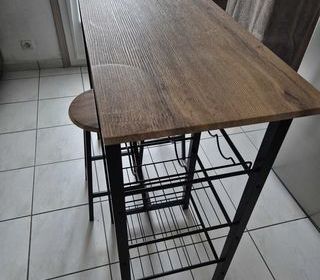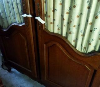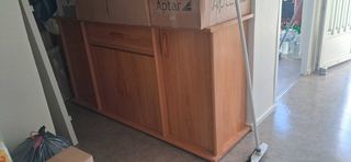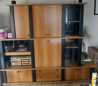 Buffet vaisselier en bois, composé de plusieurs portes et tiroirs, comprenant une partie haute avec rangements fermés et une partie basse avec tiroirs, placards et étagères ouverte