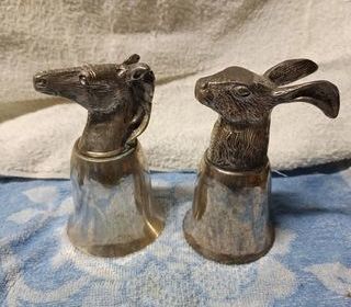 Ancien gobelet thème chasse en métal argenté et bronze argenté Tête en bronze argenté gobelet en métal argenté Env 14 cm de hauteur Les 2 : 80 € 6 disponibles
