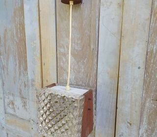 Lampe Suspension Bois et Verre Pointe de Diamant Design Vintage Scandinave. Dimensions : Hauteur seule 16cm (avec fil 60cm), largeur 15,5cm, cotés bas 16cm, haut 12cm. Bon ét