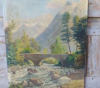 Tableau Paysage de Montagne Romanini-Aragon Denise Huile sur carton fort, format 41cm x 32cm Bon état, assombrissement dû à l'âge un petit manque de peinture et carton lé