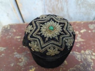 Ancienne Boite à Bijoux ou à Aiguilles Velours Noir Brodé Fil Métal et Perle Hauteur 8cm, diamètre 7,5cm. Très bon état