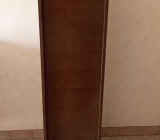 Meuble classeur en bois marron avec façade à rideau. Parfait pour organiser et ranger vos documents ou fournitures de bureau . En bois couleur marron Façade à rideau coulissant,