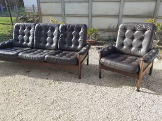 ensemble+salon+canapé+plus+deux+fauteuils+bois+et+cuir+design+scandinave+longueur+canapé+212+cm,+bon+état.