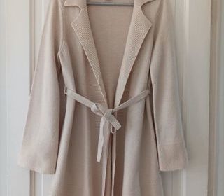Veste longue en tricot point jersey et point mousse ,à manches longues , petite ceinture amovible , Marque H&M . Taille S . Longueur 88 cm. TRES BON ETAT
