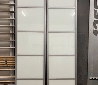 FACADE DE PLACARD COULISSANTE. 2 façades coulissantes 2 vantaux. Hauteur 2500mm largeur 1200mm. Panneaux verre laqué blanc. Profil et rail en métal laque couleur alu. 150 € l'