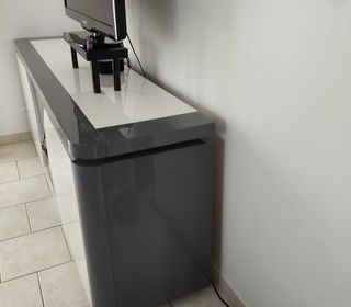 Buffet bas brillant gris foncé et blanc cassé, vitres teintées. Longueur 220 cm hauteur 83cm profondeur 50cm. 2 étagères au milieu et 1 de chaque côté.