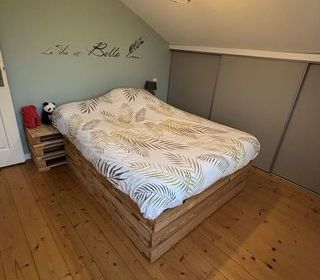 Je vends ce lit en palette compatible avec un matelas de 140x190 cm ou 140x200cm Les dimensions du lit sont de 201cm de large au niveau des " tables de nuit " pour une longueur t