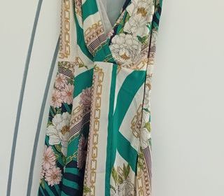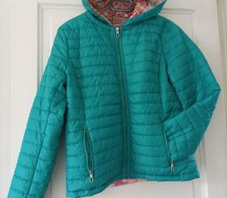 Doudoune / blouson matelassé chaude , capuche amovible par petits boutons . Doublure fleurie pour égayer le tissu vert et l'hiver ? ?Marque Escandelle Paris . Taille 40 PARFAIT ET