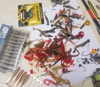 LOT DE PECHE POUR PERCHE BROCHET SANDRE CANNE NEUVE AVEC MOULINET EQUIPE TRESSE UNE TRANTAINE DE LEURES METALIQUES PRIX 4 EUROS PIECE NOMBREUX LEURES SILICONE ET DES TETES PLOMBE