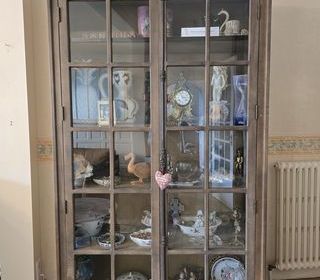 Vitrine d'esprit 18ème en chêne teinté, étagères panneaux de particules, placage chêne grisé 2portes vitrées Fermeture par cremone a l'ancienne Poignée en métal patiné 4e