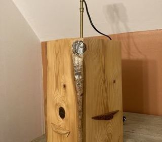 Vends pied de lampe en bois (sapin) verni, de section carrée. Hauteur 33 cm, section 19 x19 cm. Très original et décoratif, 3 des 4 faces sont ornées de demi-coques de bateaux mi