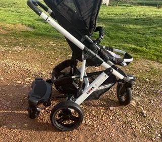Poussette en super état 3 en 1 avec nacelle, cosy et poussette. Vendue avec petite tablette à l'arrière démontable pour supporter un autre petit. Vendue avec support Isofix pour le