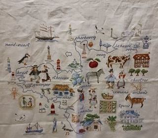 Toile brodée main régionale, de BREST à TOURS/LE HAVRE,chaque ville avec sa spécialité. Taille totale:70x63, partie brodée:55x46, à encadrer. Expédition possible