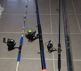 LOT DE CANNES A PECHE AVEC COFFRE TABOURET 3 TIROIRS , NEUFS JAMAIS SERVI ! . CANNES TÉLESCOPIQUES PLUS 3 METRES POUR CERTAINES. , AVEC MOULINETS NEUFS ET LEURS FILES . LOT VENDU