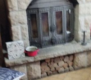 Cheminée pierre granit avec insert tout fonte (portes à revoir) en bon état ,gaine de sortie en inox et tuyauterie,poutre bois châtaignier ciselée en place à démonter et enlever.