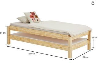Deux lits superposables /séparables en bois clair verni avec sommier. Dimensions du lit indiquées : 201 cm de long, 89 cm de large, 54 cm de haut. Etat neuf