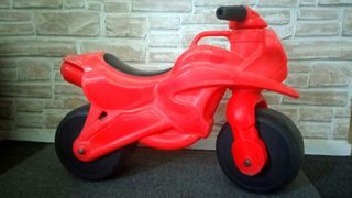 Moto rouge convenant à un enfant de 2 à 5 ans. Très bon état de fonctionnement, mais plastique marqué à certains endroits.