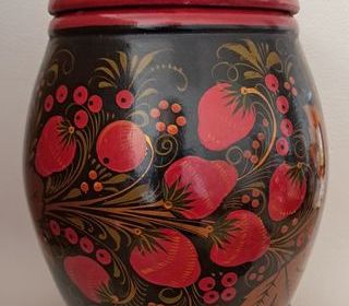 bonbonnière pot à tabac gingembre thé en bois laqué peint à la main décor floral et fruits artisanat russe Khokhloma patiné par le temps, peinture craquelée par endroits ha