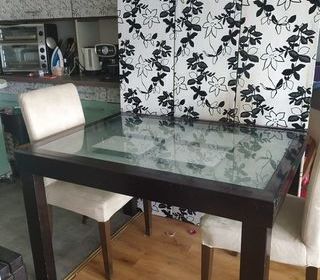 Table extensible achetée chez But, Bois foncé deux plateaux en verre. Les plateaux sont intacts, les parties en bois pieds et cadres présentent des trace d'usure due aux déménagem