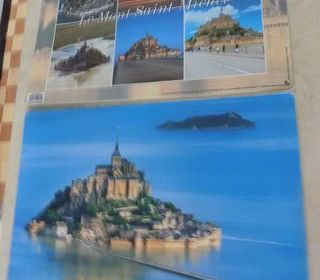 Lot de 4 sets de table comprenant 2 différents sur le Mont Saint-Michel, 1 publicitaire fromage le roulé et 1 plus petit publicitaire Poulain