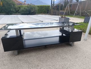 table meuble télé dessus table verre fumé étagère verre fumé pieds alu 2 tiroirs négociation possible