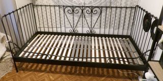 Lit banquette 1 personne en fer forgé noir, en très bon état, avec * matelas 200 x 90 * et sommier à lattes, réglable et à renfort lombaire. Dimensions : longueur totale 205