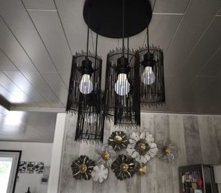 Je vend deux lustres ,ils ont 5 ampoules,les fils peuvent se tendre jusqu'à 1,50m.On peut mettre les éclairages a certaines hauteurs .Je laisse les ampoules.Ils sont en fer noir.Tr