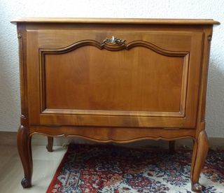 Parfait état Très pratique, ce meuble en noyer clair a été spécialement conçu pour faciliter le rangement des verres et bouteilles. Peut servir de rangement pour des CD ou des do