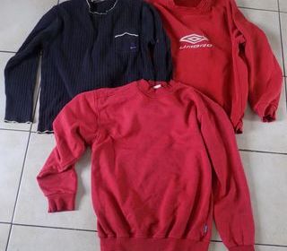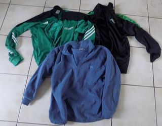 Lot de 2 vestes de survêtement comprenant une verte Adidas et une noire Givova, un pull polaire bleu, un jean noir légèrement délavé Bonobo et 2 tee-shirts dont 1 vent d'ouest et l