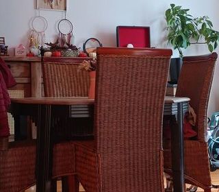 Je vends ce lot de 4 chaises en rotin. - Type de produit : Chaises en rotin - Quantité : 4 - Matériau : Rotin et osier - Couleur : Bois naturel - Pièce : Cuisine et salle à