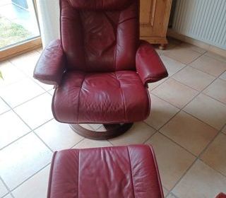 Fauteuil relax Stordal Stockholm avec son repose pieds. Cuir bordeaux (cherry), pivotant et inclinable, socle bois wengé. Année 2015 A prendre sur place.