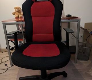 Chaise de bureau rouge et noir avec roulettes et réglable. Bon état.