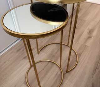 Deux tables gigogne miroir avec pieds dorés. Achetées chez Zara Home. Grande : diamètre : 40 cm et hauteur : 65 cm. Petite : diamètre 33 cm et hauteur 58 cm. Remise en mains propr