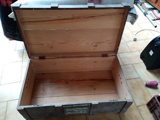 malle de voyage datant des années 60 en bois de pin couleur marron dimensions 89x52 cm hauteur 34 cm elle est dans son jus, restaurée avec des pieds ou des roulettes peut faire une
