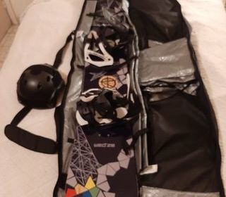 Planche de snowboard avec les fixations , sa housse de protection et de trancport ainsi que le casque.
