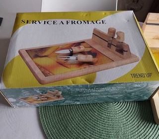 Plateau à fromage en bois, dimensions 35x25cm comprenant: 4 couteaux en inox avec manche bois. 1 plaque en verre trempé hygiénique et facile à nettoyer. Neuf dans sa boîte d'or