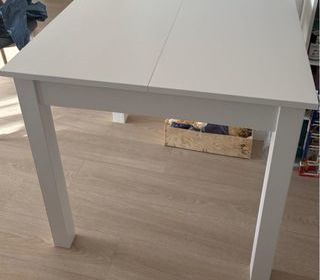 Bonjour, Je vends une table blanche 80*80, avec une rallonge qui fait 120*80. La table viens du magasin but. Avec deux chaises en matière tissu gris foncé et les pieds couleur