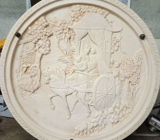 Bas relief en résine, couleur ivoire, décor caléche Asiatique,à poser où à suspendre,, diamètre 44 cm épaisseur 3 cm.