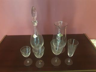 Service à verres en Cristal de 48 pièces 12 verres à Porto 11 verres à vin 11 verres à eau 12 flà"tes à Champagne 1 carafe à vin et une carafe à eau