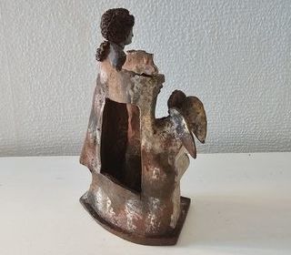 Statuette type Tanagra en terre cuite à engobe blanc représentant une femme drapée près d'un angelot. Monde grec, probablement période hellénistique. Hauteur: 16cm Restaurée, tête